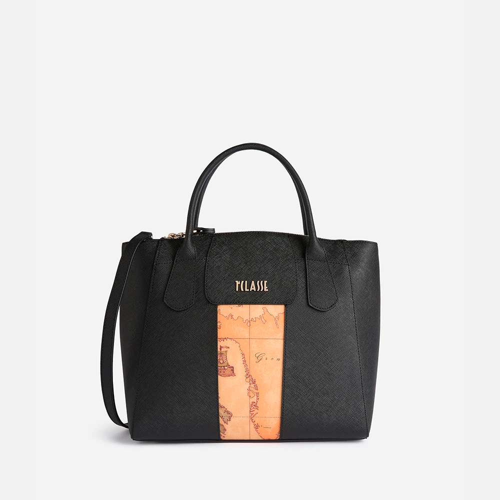 Realizzata in tessuto saffiano, la borsa a mano grande Windy City si ispira alle affascinanti città scozzesi: le architetture slanciate dalle finestre verticali si riflettono nel design del modello, caratterizzato dalla toppa sagomata con maxi logo 1ᴬ Classe che sovrasta l'inserto nell'iconico tessuto Geo Classic.