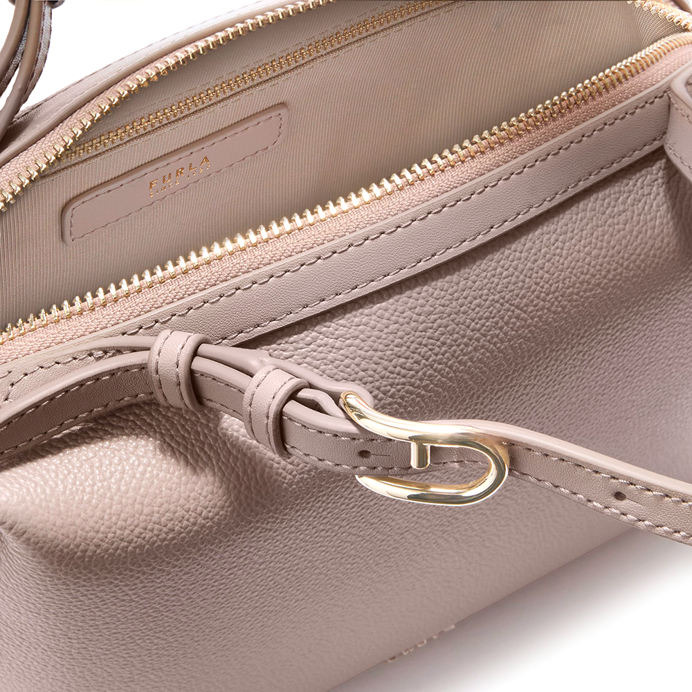 Linee morbide dal design versatile per il bauletto Furla Double. Il modello realizzato in pregiata pelle di vitello granata presenta un formato mini perfetto per il tempo libero. La tracolla abbinata regolabile e rimovibile, ne consente molteplici opzioni d'utilizzo. I due manici sono decorati dagli iconici loghi Archi in metallo e dall'anello a D a cui agganciare charms per personalizzare il proprio look.