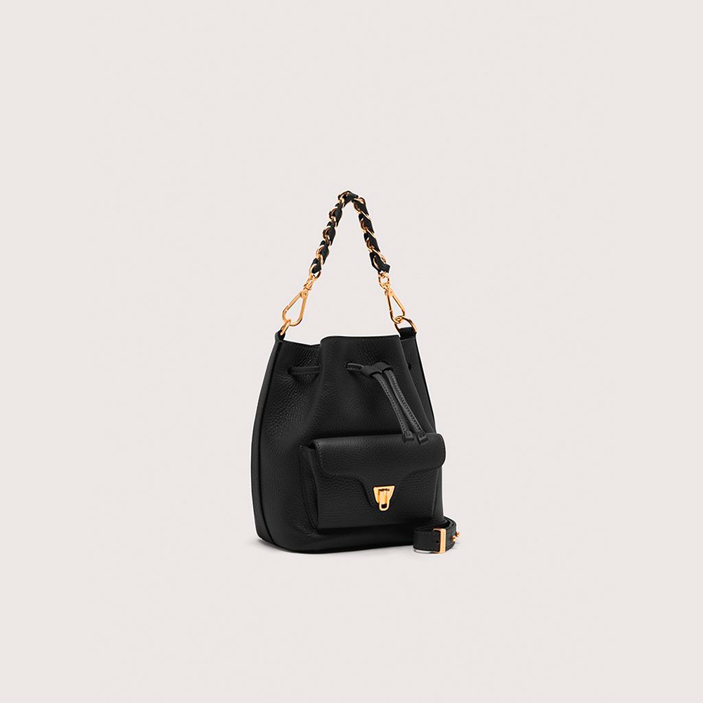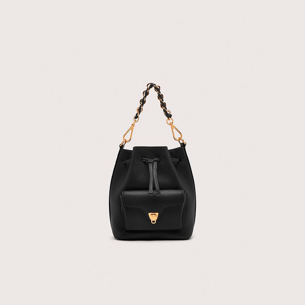 Coccinelle Beat è una tra le icone del brand: la distintiva chiusura a battente con il plettro è il simbolo d’identità Coccinelle, che per questa collezione si reinventa con funzionalità contemporanee ed eleganti. Il mini secchiello è impreziosito dal manico in pelle e catena, un mix perfetto tra struttura e morbidezza, tra praticità e design contemporaneo.