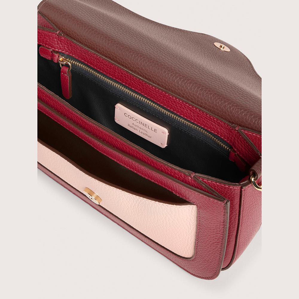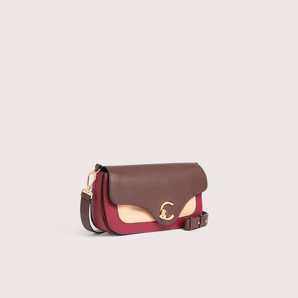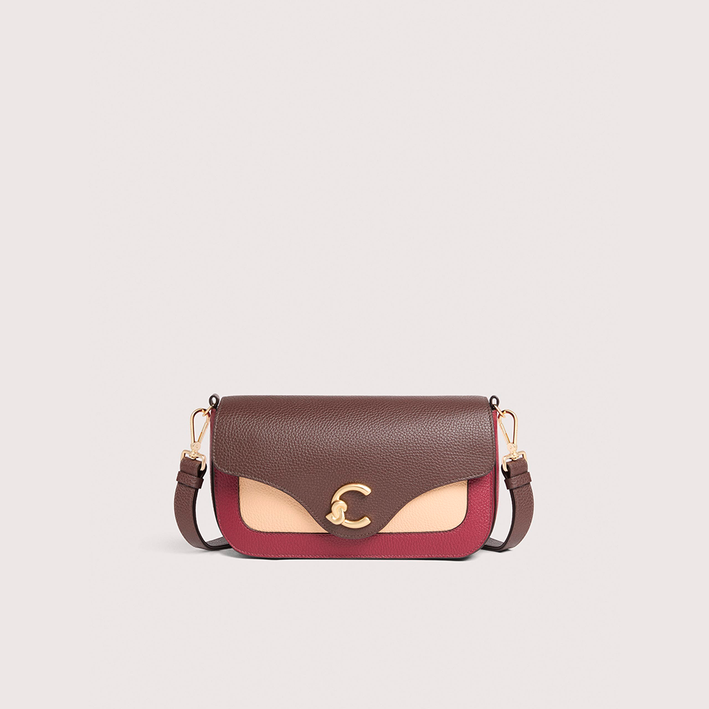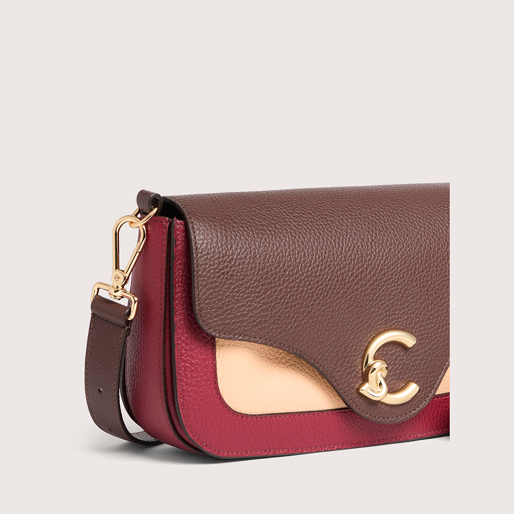 Una nuova signature entra a far parte del brand, Coccinelle C-Me. Il logo reinterpretato attraverso la C di Coccinelle che si annoda e abbraccia il plettro, elemento iconico del brand, un'unione che si intreccia con la vita di una donna tra passato e presente. Le linee geometriche e le curve sofisticate rafforzano il design, mentre la costruzione a soffietti aggiunge un tocco di funzionalità e delicata eleganza a questa borsa che vuole essere la compagna essenziale della donna Coccinelle durante la sua giornata. Questo modello è realizzato in pelle lavorata tramite specifici macchinari e poi bottalata al fine di mantenerne la morbidezza. È una pelle molto resistente che si presta a una facile pulizia, ideale per un uso quotidiano.