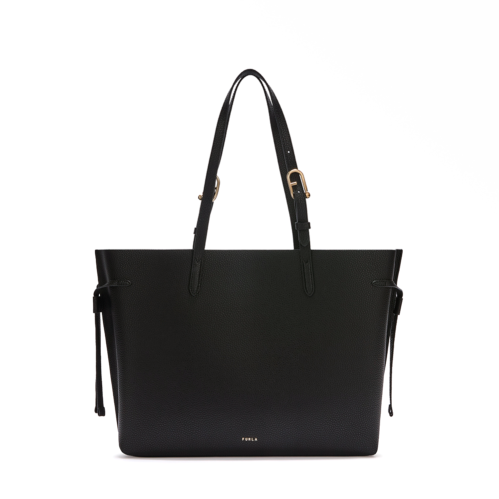 La tote bag Furla Ava è realizzata in elegante pelle di vitello rifinita reversibile con interno a contrasto dall'effetto cromatico colorblock. Il modello di ampie dimensioni presenta un interno molto capiente per ospitare tutti i propri essentials. I doppi manici lunghi regolabili tramite l'hardware con logo Arco, ne consentono un indosso sia in versione top handle che a spalla.