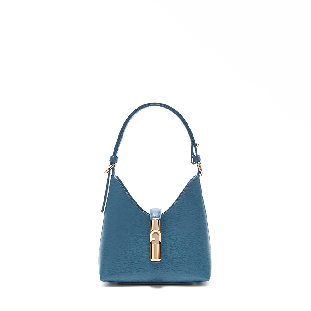 La mini hobo bag Furla Iride si distingue per la silhouette morbida a trapezio realizzata in pelle stampata. La borsa è arricchita da una fascetta abbinata impreziosita dal nuovo hardware ciclindrico con pesetto decorato dall'iconico logo Arco Furla che tiene chiuso il modello. L'interno aperto è compatto per ospitare i propri essentials.