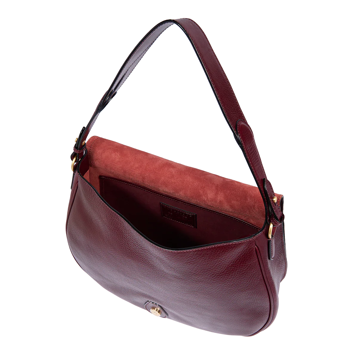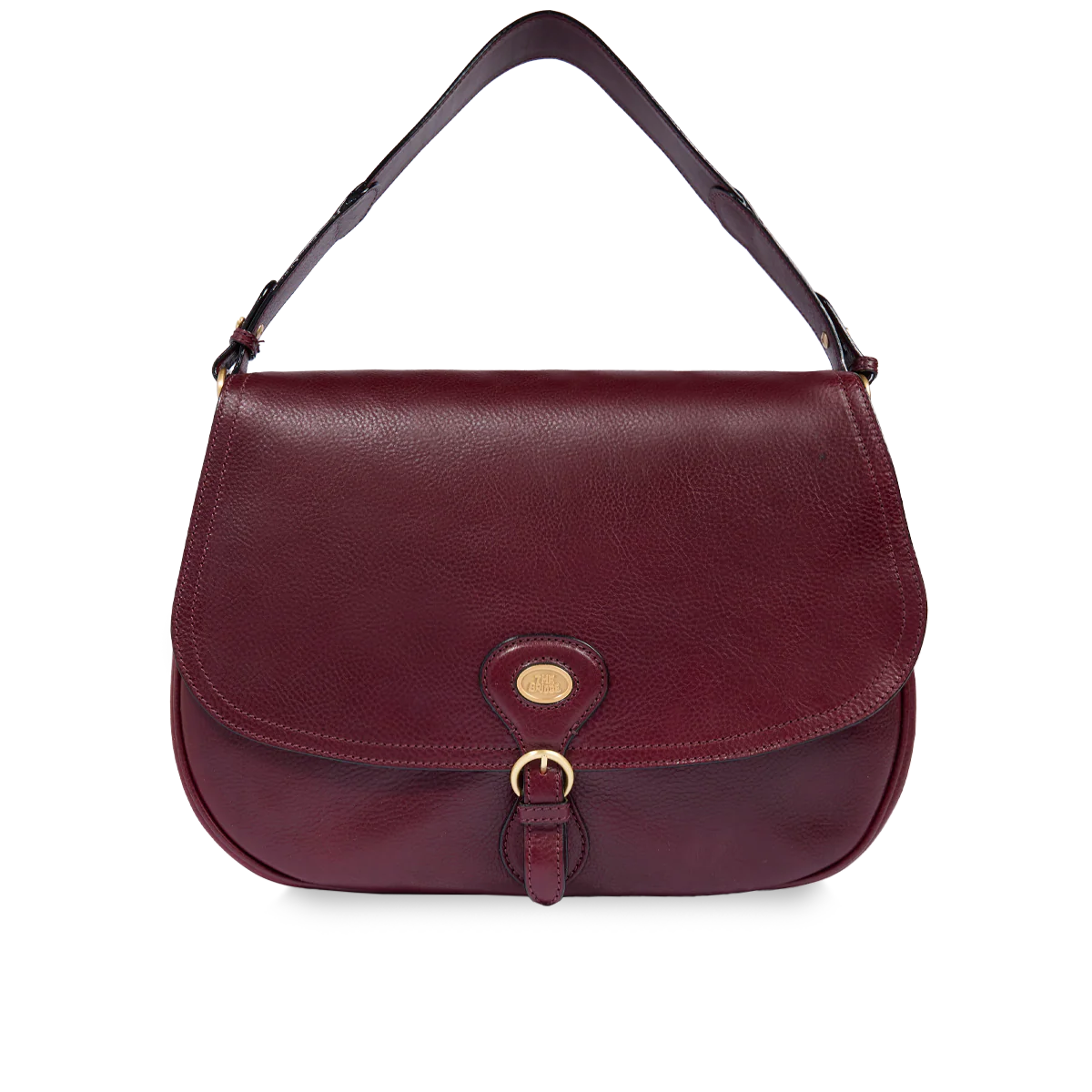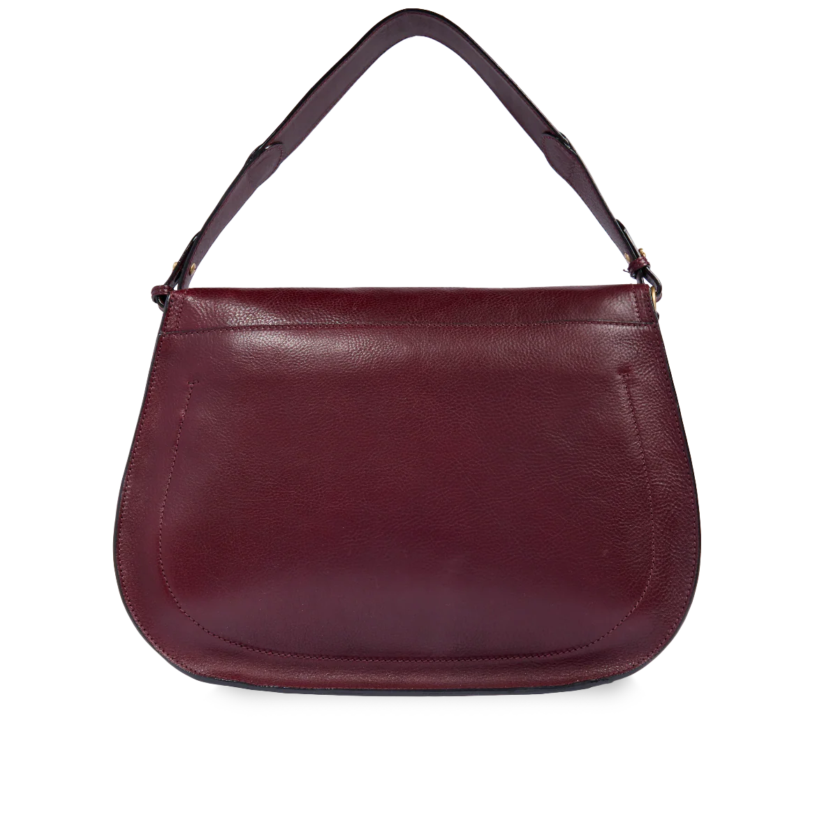 Borsa in pelle con tracolla removibile e doppia portabilità, da portare a spalla o a mano, con patta e fibbia frontale.
