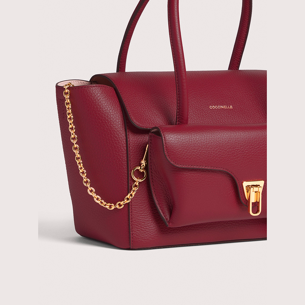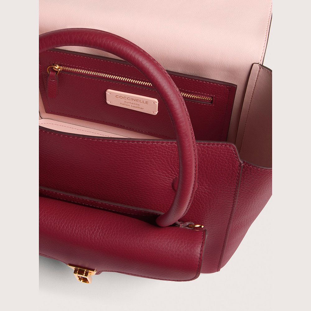 Coccinelle Double Beat è una vera daily companion, una borsa capiente con patta, da indossare a spalla o crossbody, grazie ai manici tubolari o alla comoda tracolla regolabile. Grazie ad un innovativo funzionamento, la tasca frontale è staccabile e si trasforma all’occorrenza in pouch portatutto o in elegante clutch da indossare per le occasioni più speciali. La tasca, infine, è anche simbolo di identità Coccinelle grazie all'iconico dettaglio plettro. Questo modello è realizzato in pelle lavorata tramite specifici macchinari e poi bottalata al fine di mantenerne la morbidezza. È una pelle molto resistente che si presta a una facile pulizia, ideale per un uso quotidiano.