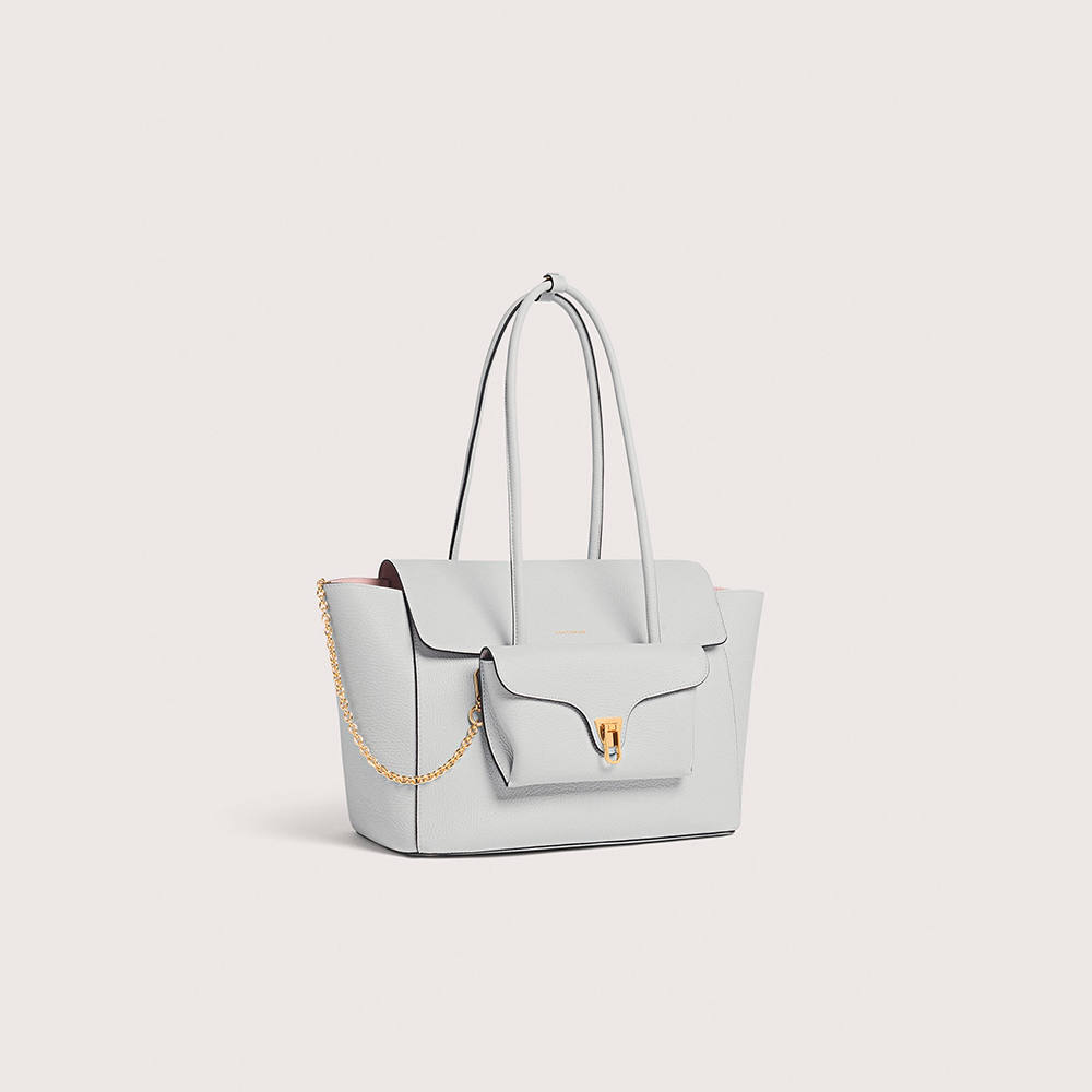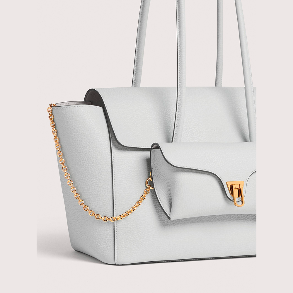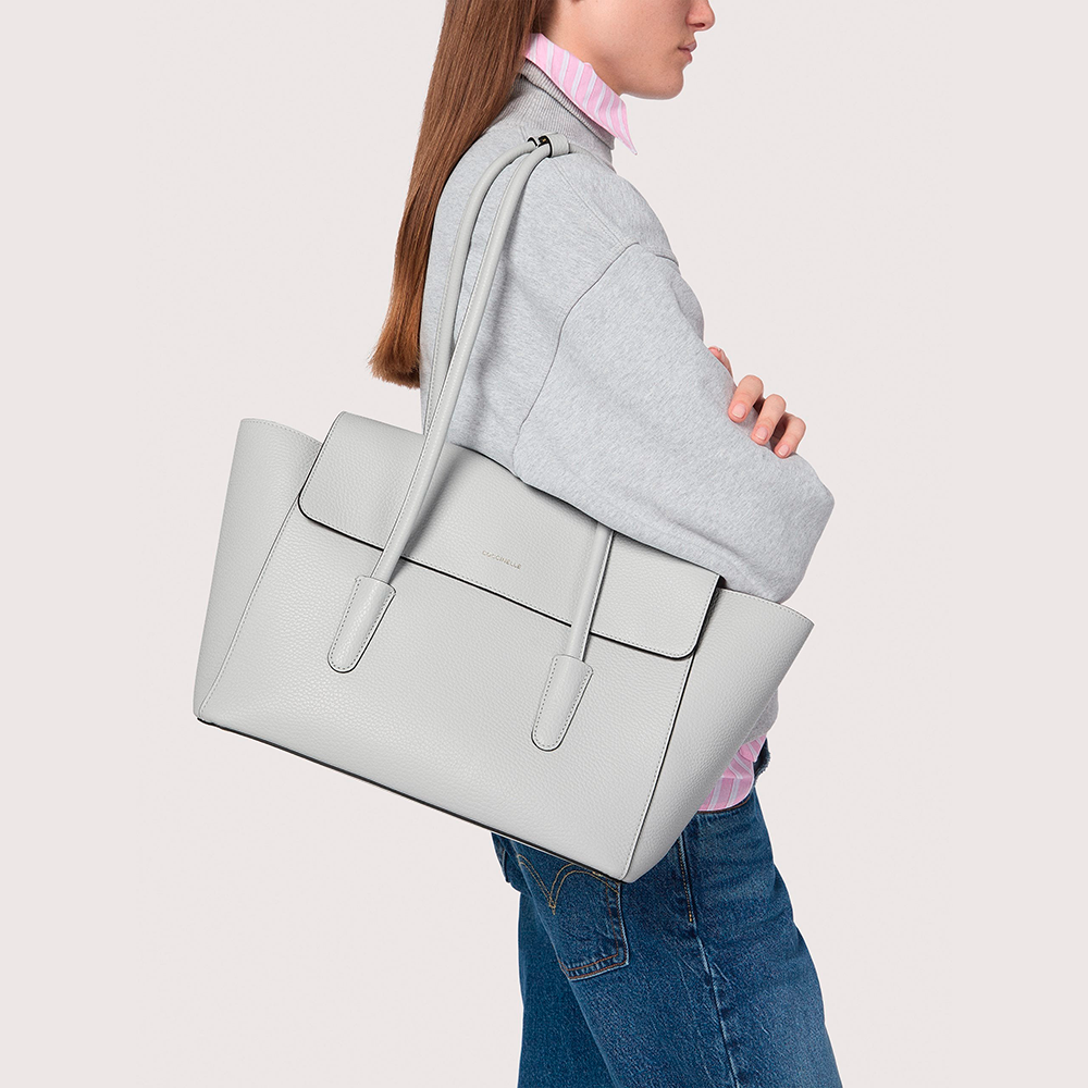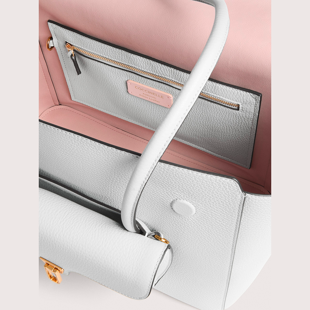 Coccinelle Double Beat è una vera daily companion, una borsa capiente con patta, dotata di pratici manici tubolari per essere indossata comodamente a spalla. Grazie ad un innovativo funzionamento, la tasca frontale è staccabile e si trasforma all’occorrenza in pouch portatutto o in elegante clutch da indossare per le occasioni più speciali. La tasca, infine, è anche simbolo di identità Coccinelle grazie all'iconico dettaglio plettro.