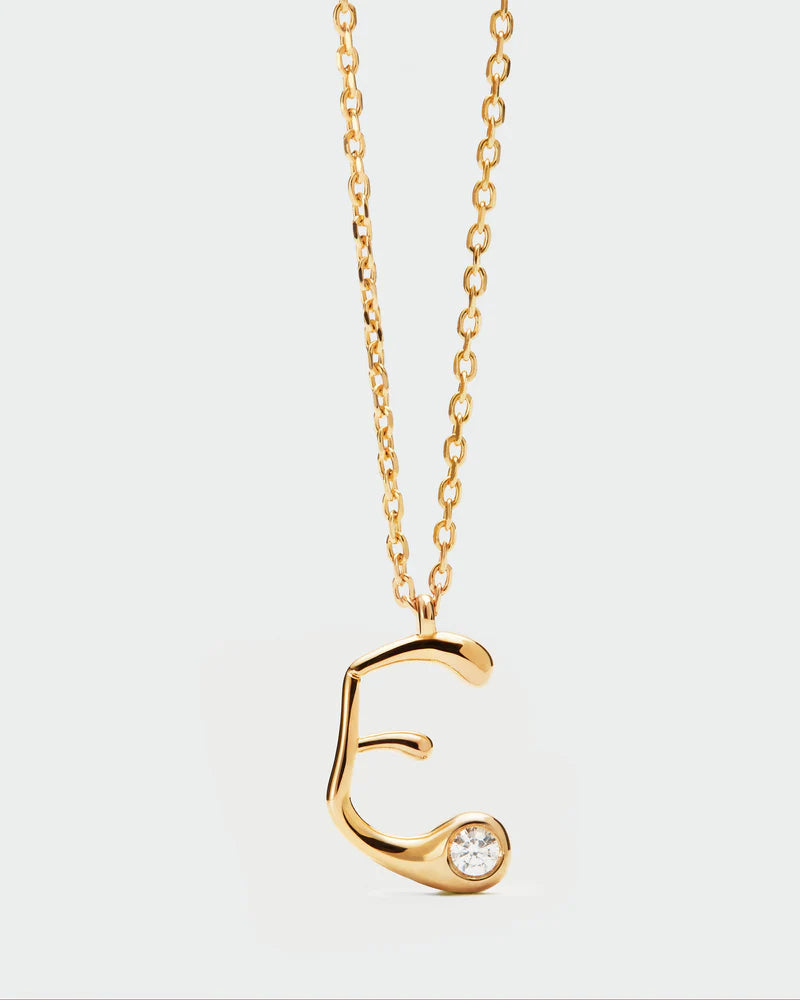 Collana in argento sterling placcato oro, con ciondolo iniziale E dalle linee morbide e sinuose.
