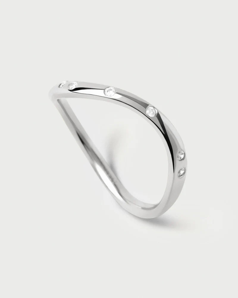 Elegante anello in argento ornato di zirconi bianchi e linee fluenti