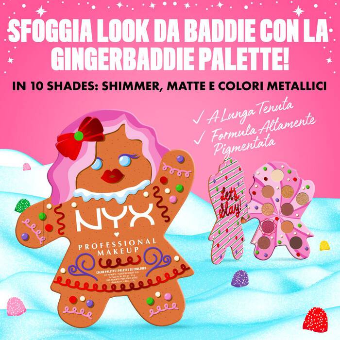 Sfoggia look da baddie per le feste con la NYX Professional Makeup Holiday Gingerbaddie Palette! Questa palette in edizione limitata racchiude sfumature matte sensuali, shimmer brillanti e metallici intensi ispirati alle vibes speziate delle feste. Con toni caldi come marrone gingerbread, caramello dorato e mirtillo rosso, ogni shade è super pigmentata e si sfuma facilmente, perfetta sia per un soft glam che per un look bold. La sua formula garantisce un’applicazione smooth e una tenuta impeccabile.
