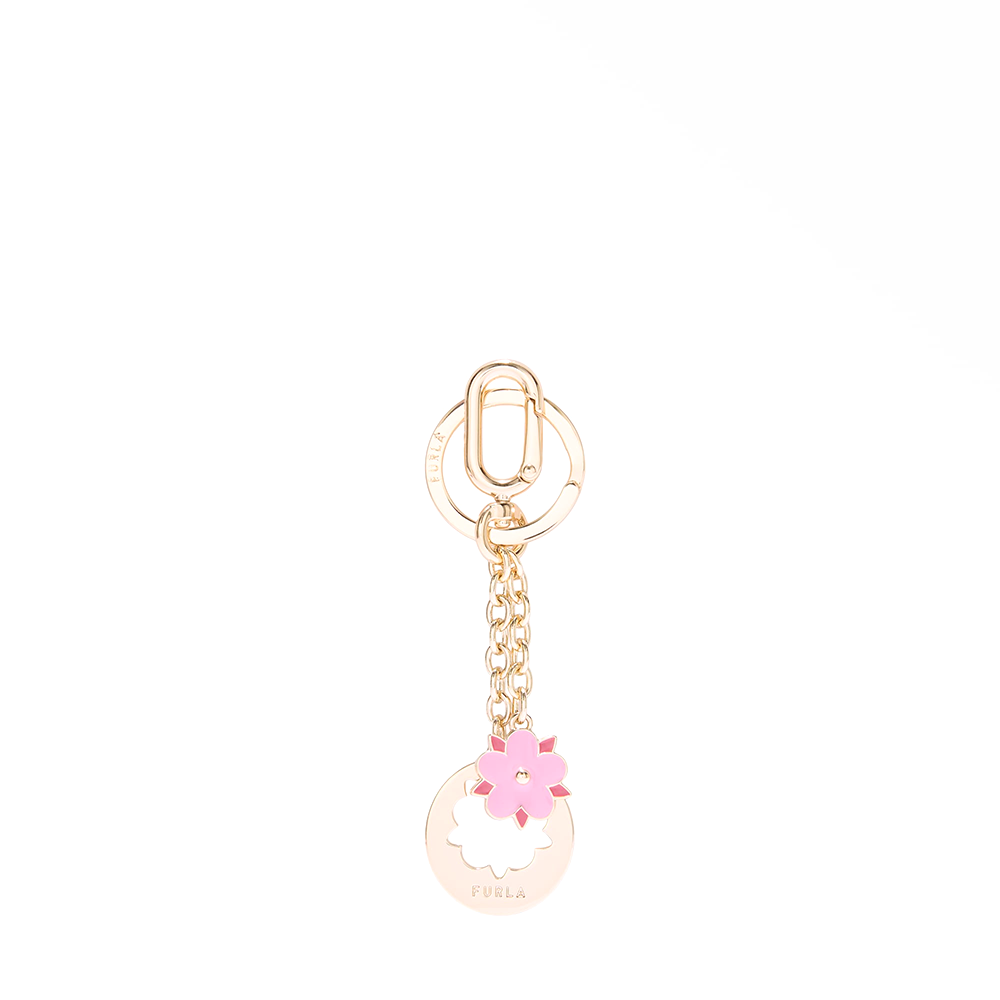 Il ciondolo smaltato con forma a fiore caratterizza il portachiavi Furla Crystal. Sovrapposto al cerchio in metallo forato, è perfetto per tenere in ordine chiavi o per diventare un dettaglio distintivo di borse e accessori.