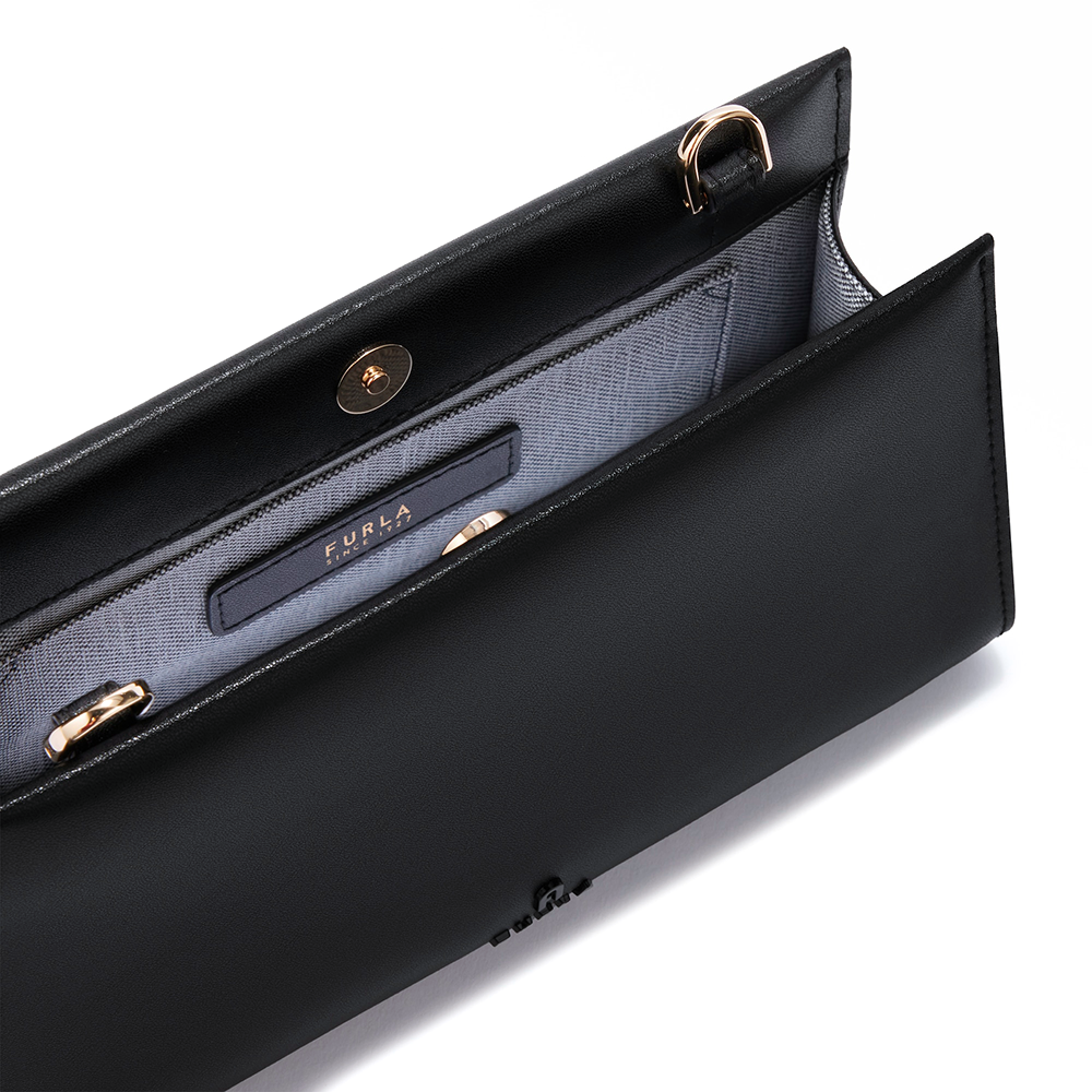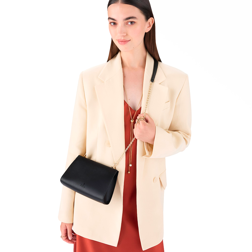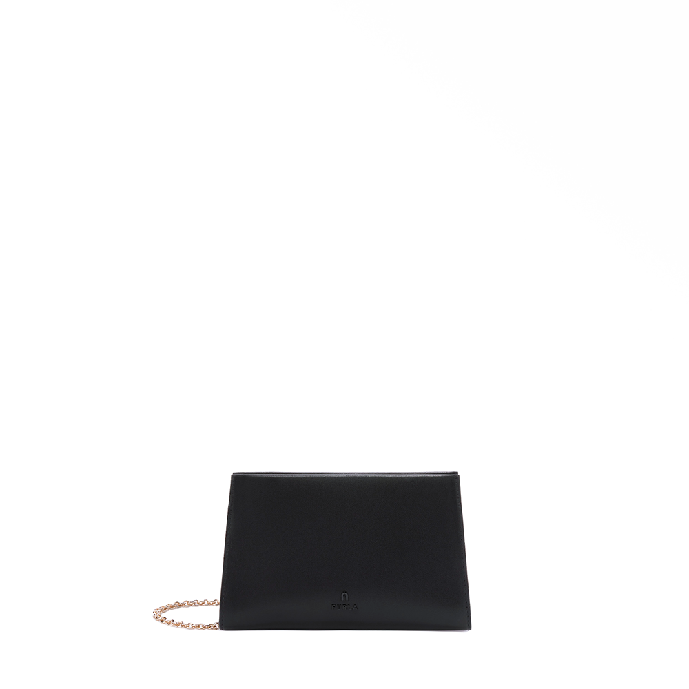Eleganza in formato mini per la clutch Furla Myfurla. Realizzata in morbida pelle liscia, si distingue per le sue linee geometriche dalla forma a trapezio. La tracolla a catena con spezzone in pelle è rimovibile e permette di indossare il modello sia in versione crossbody sia come sofisticata pochette.